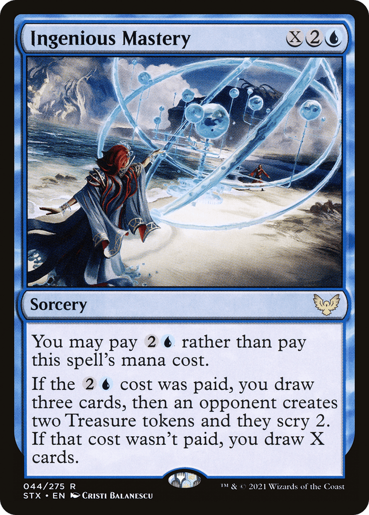 If the {2}{U} cost was paid, you draw three cards, then an opponent creates two Treasure tokens and they scry 2. If that cost wasn’t paid, you draw X cards.