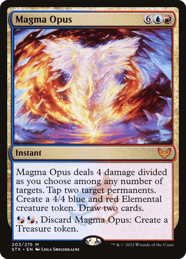 Magma Opus deals 4 damage divided as you choose among any number of targets. Tap two target permanents. Create a 4/4 blue and red Elemental creature token. Draw two cards.