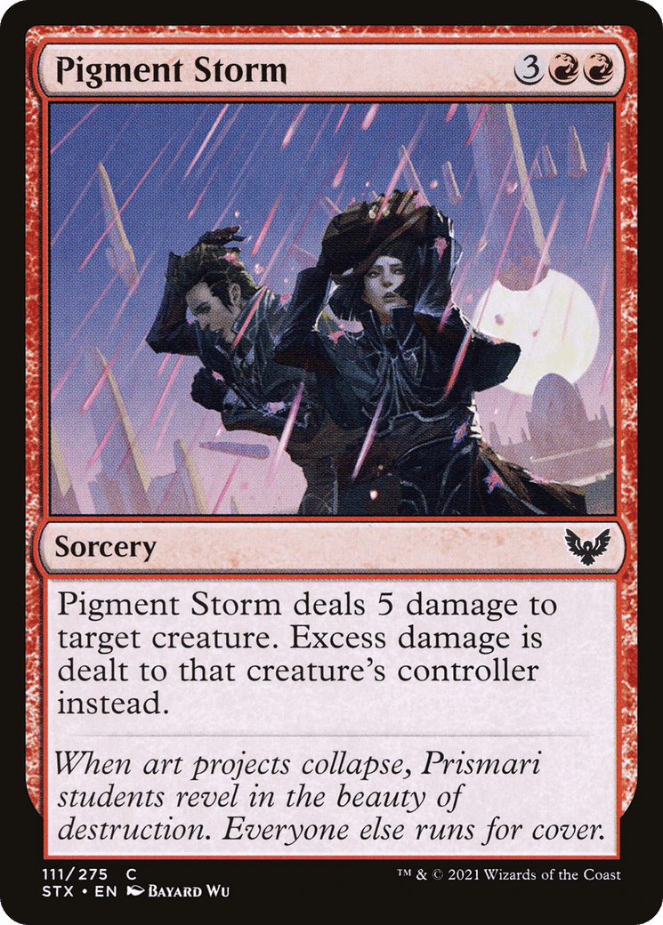Pigment Storm deals 5 damage to target creature. Excess damage is dealt to that creature’s controller instead.