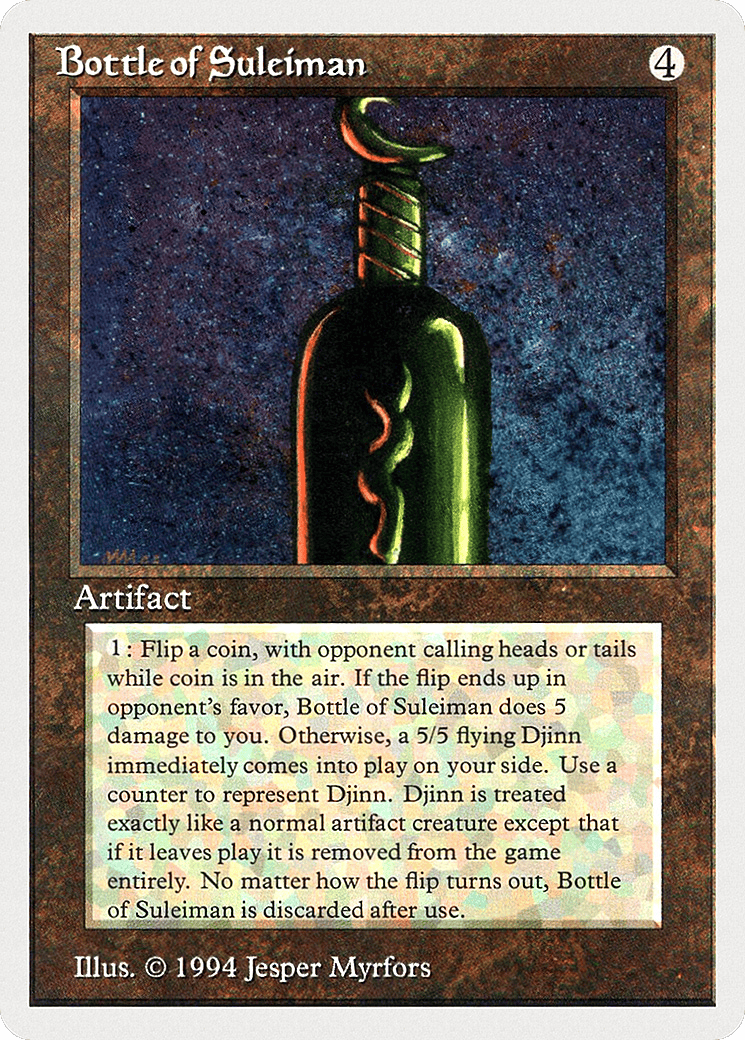 {1}, Sacrifice this artifact: Flip a coin. If you win the flip, create a 5/5 colorless Djinn artifact creature token with flying. If you lose the flip, this artifact deals 5 damage to you.
