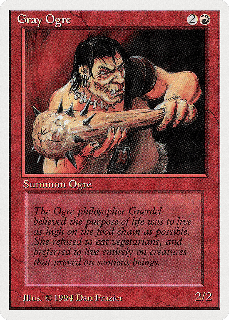 The Ogre philosopher Gnerdel believed the purpose of life was to live as high on the food chain as possible. She refused to eat vegetarians, and preferred to live entirely on creatures that preyed on sentient beings.