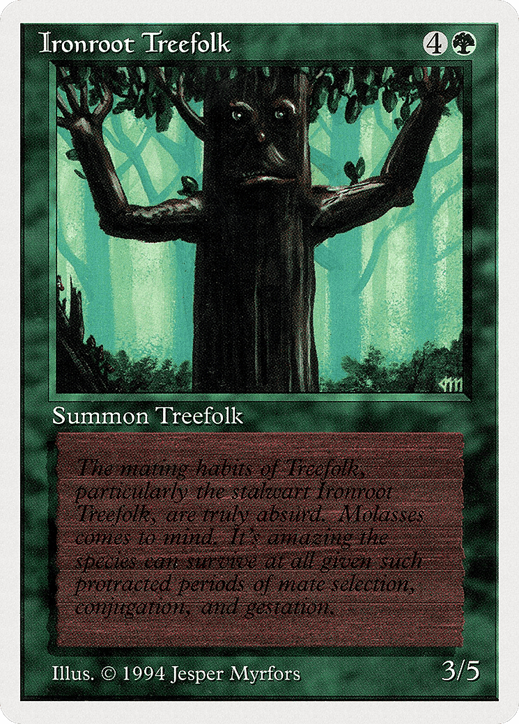 The mating habits of Treefolk, particularly the stalwart Ironroot Treefolk, are truly absurd. Molasses comes to mind. It’s amazing the species can survive at all given such protracted periods of mate selection, conjugation, and gestation.
