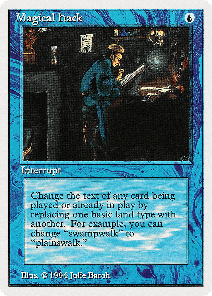 Change the text of target spell or permanent by replacing all instances of one basic land type with another. (For example, you may change “swampwalk” to “plainswalk.” This effect lasts indefinitely.)