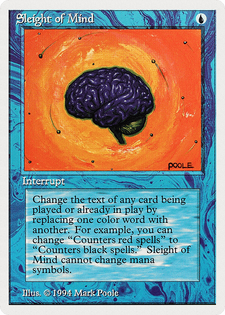 Change the text of target spell or permanent by replacing all instances of one color word with another. (For example, you may change “target black spell” to “target blue spell.” This effect lasts indefinitely.)