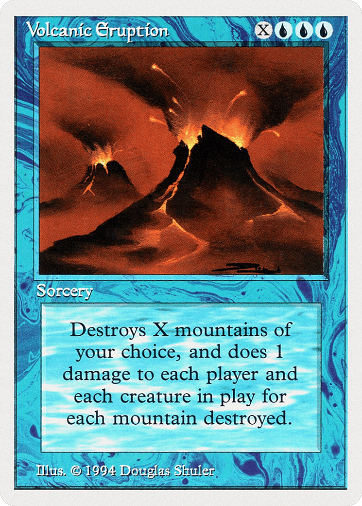 Destroy X target Mountains. Volcanic Eruption deals damage to each creature and each player equal to the number of Mountains put into a graveyard this way.