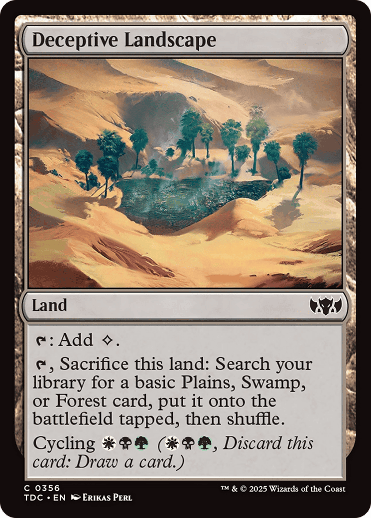 {T}, Sacrifice this land: Search your library for a basic Plains, Swamp, or Forest card, put it onto the battlefield tapped, then shuffle.