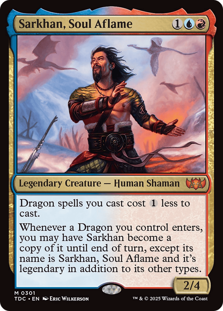 Whenever a Dragon you control enters, you may have Sarkhan become a copy of it until end of turn, except its name is Sarkhan, Soul Aflame and it’s legendary in addition to its other types.