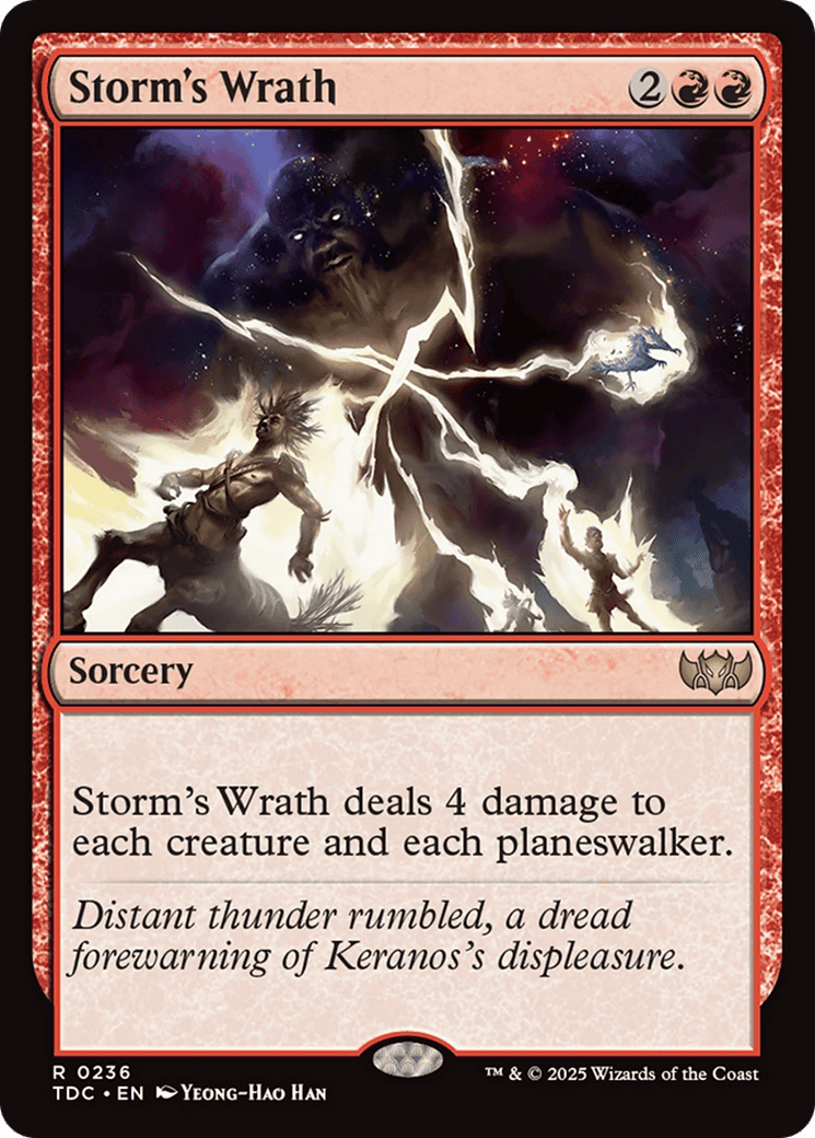 Storm’s Wrath deals 4 damage to each creature and each planeswalker.