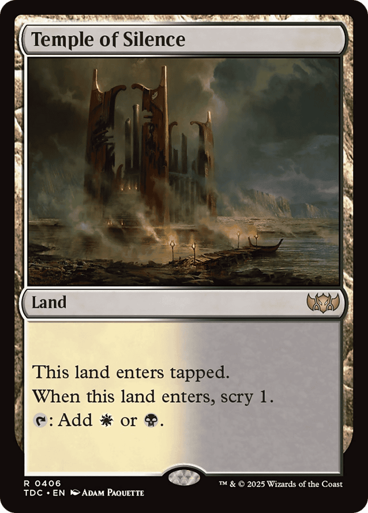 This land enters tapped. When this land enters, scry 1. (Look at the top card of your library. You may put that card on the bottom.) {T}: Add {W} or {B}.