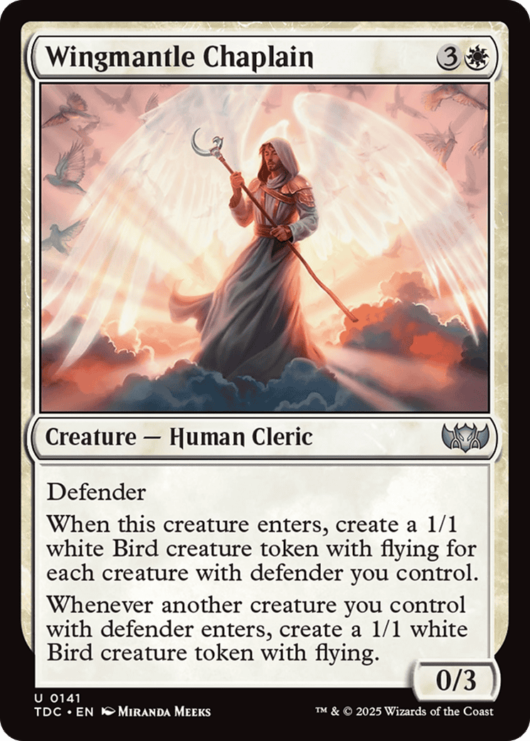 Whenever another creature you control with defender enters, create a 1/1 white Bird creature token with flying.