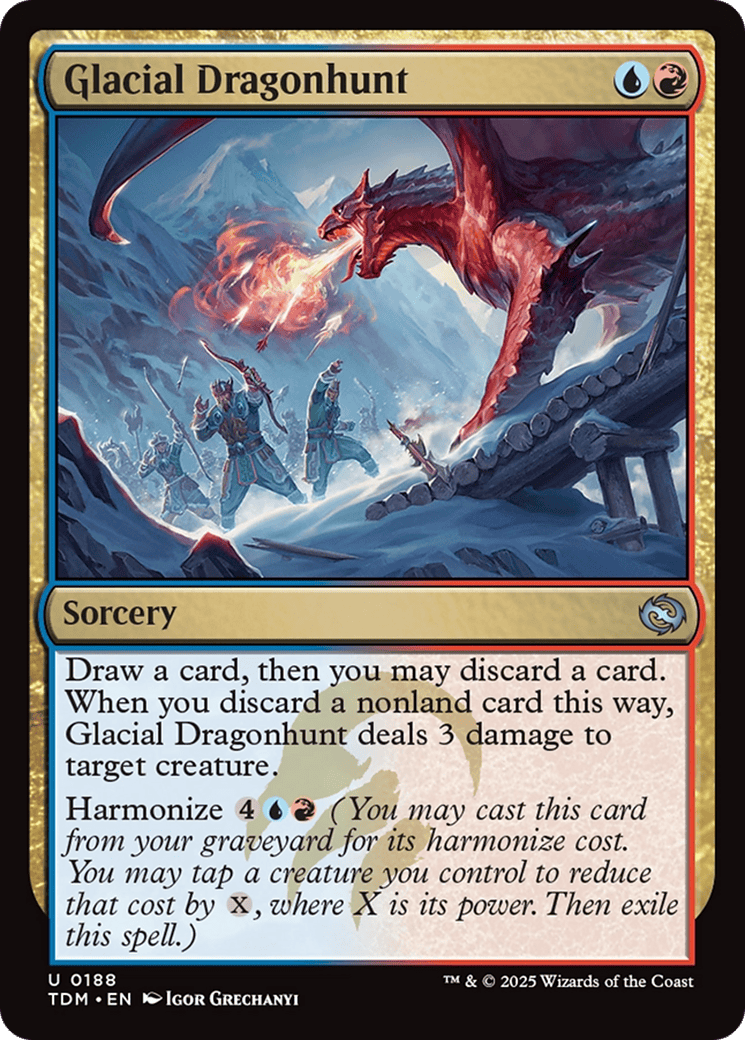 Draw a card, then you may discard a card. When you discard a nonland card this way, Glacial Dragonhunt deals 3 damage to target creature.
