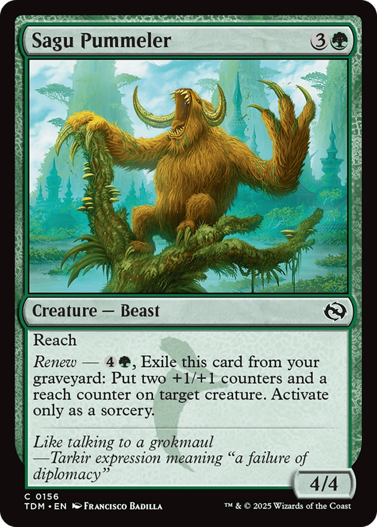 Renew – {4}{G}, Exile this card from your graveyard: Put two +1/+1 counters and a reach counter on target creature. Activate only as a sorcery.