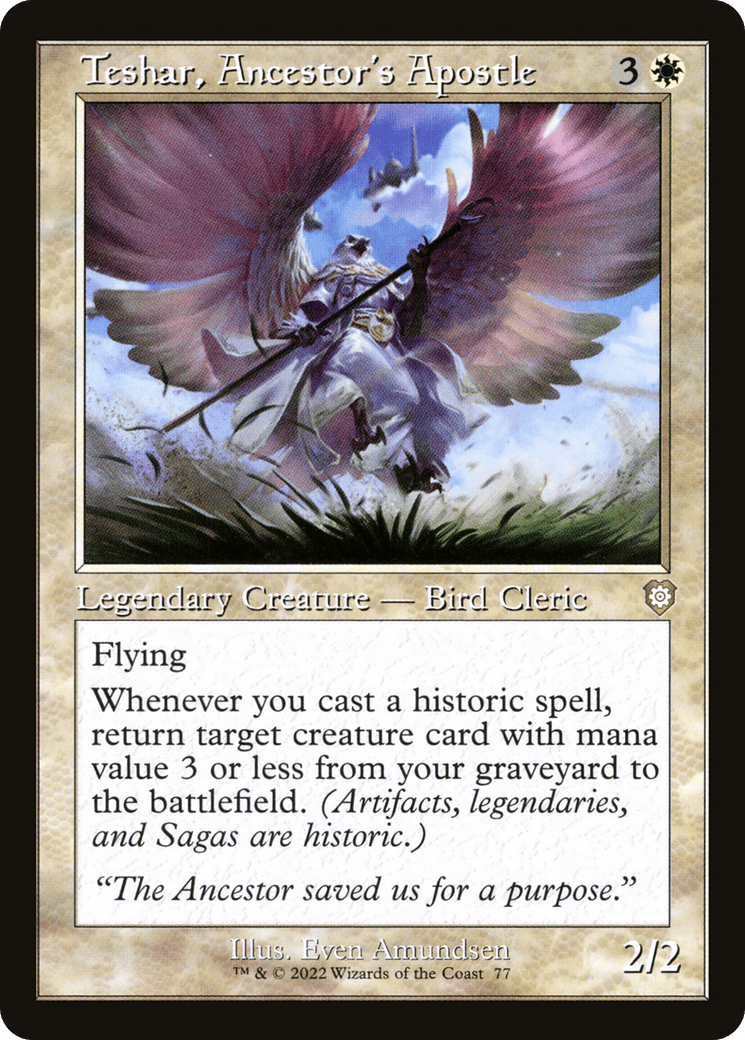 Whenever you cast a historic spell, return target creature card with mana value 3 or less from your graveyard to the battlefield. (Artifacts, legendaries, and Sagas are historic.)