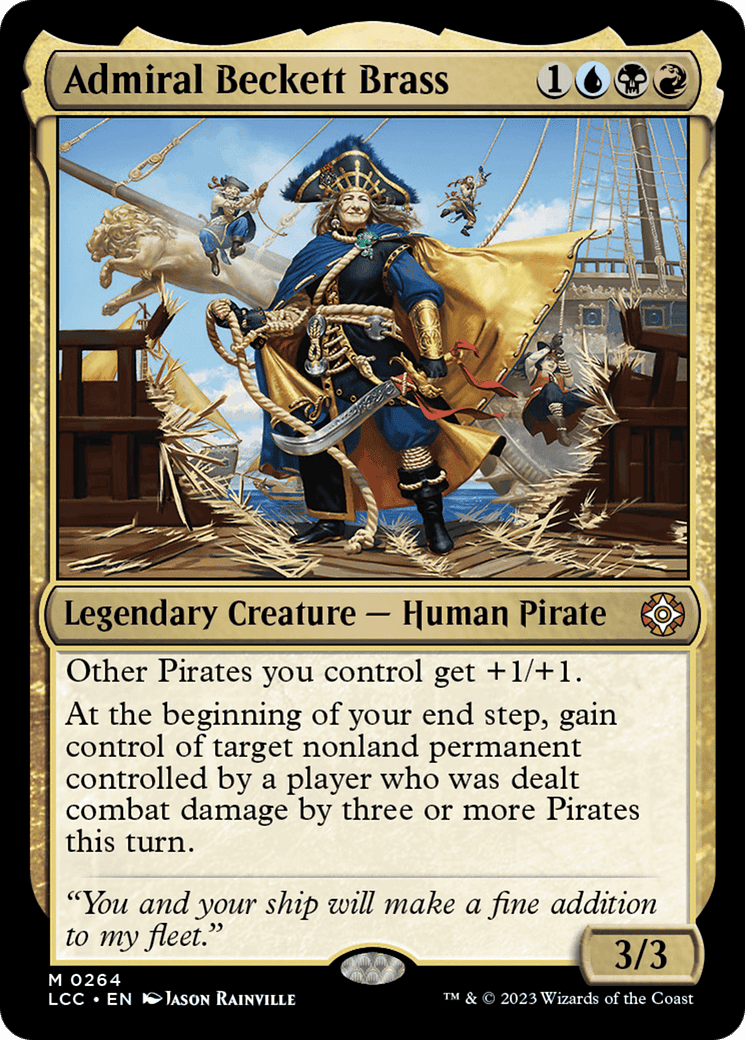 At the beginning of your end step, gain control of target nonland permanent controlled by a player who was dealt combat damage by three or more Pirates this turn.