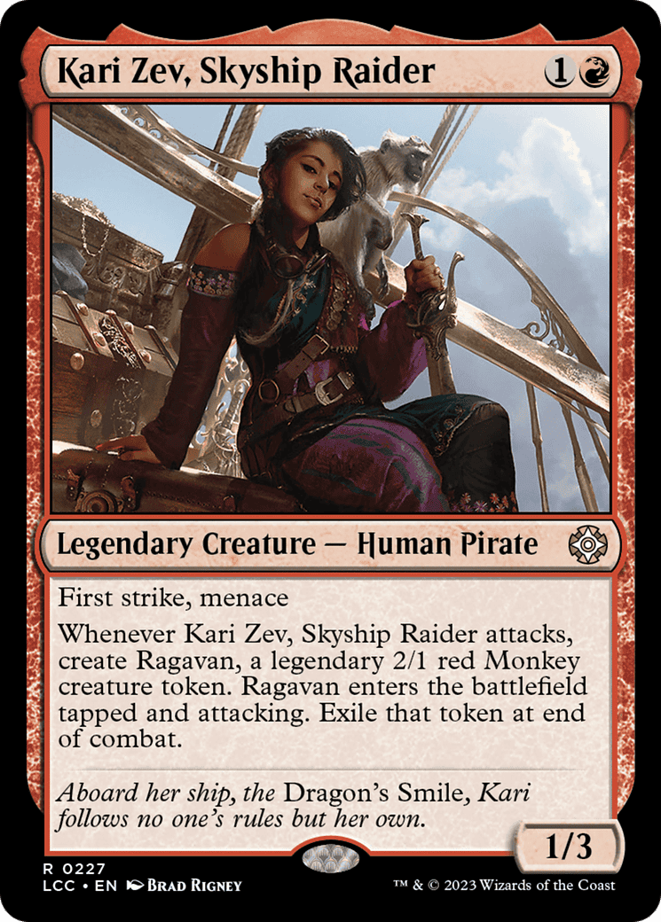 Whenever Kari Zev attacks, create Ragavan, a legendary 2/1 red Monkey creature token. Ragavan enters tapped and attacking. Exile that token at end of combat.