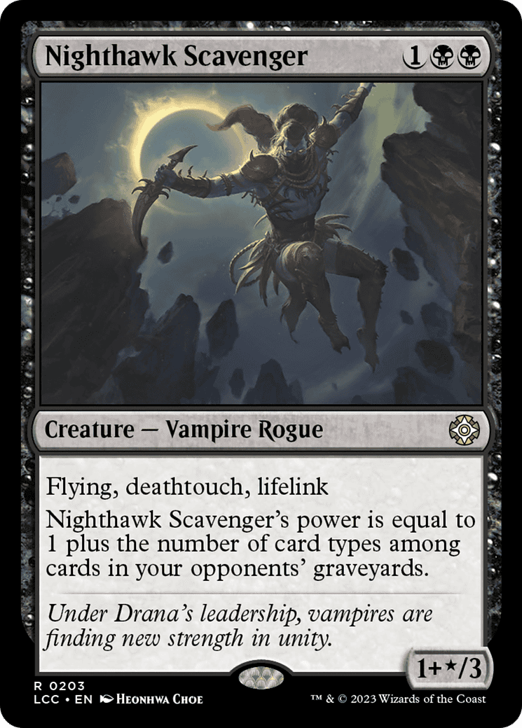 Nighthawk Scavenger’s power is equal to 1 plus the number of card types among cards in your opponents’ graveyards.