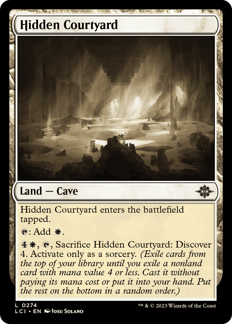 {4}{W}, {T}, Sacrifice this land: Discover 4. Activate only as a sorcery. (Exile cards from the top of your library until you exile a nonland card with mana value 4 or less. Cast it without paying its mana cost or pu