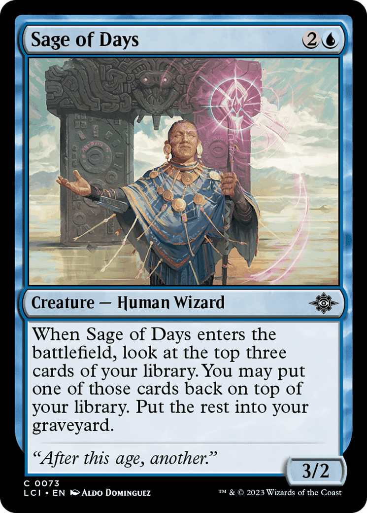 When this creature enters, look at the top three cards of your library. You may put one of those cards back on top of your library. Put the rest into your graveyard.