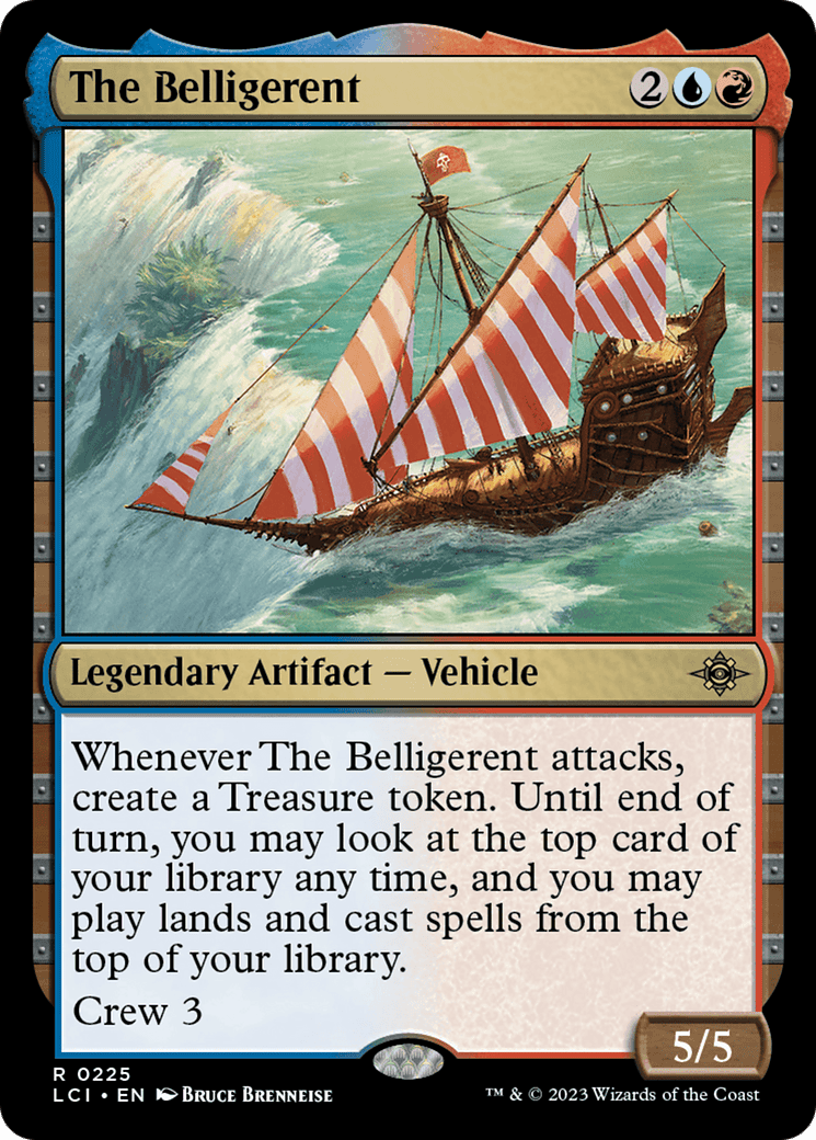 Whenever The Belligerent attacks, create a Treasure token. Until end of turn, you may look at the top card of your library any time, and you may play lands and cast spells from the top of your library.