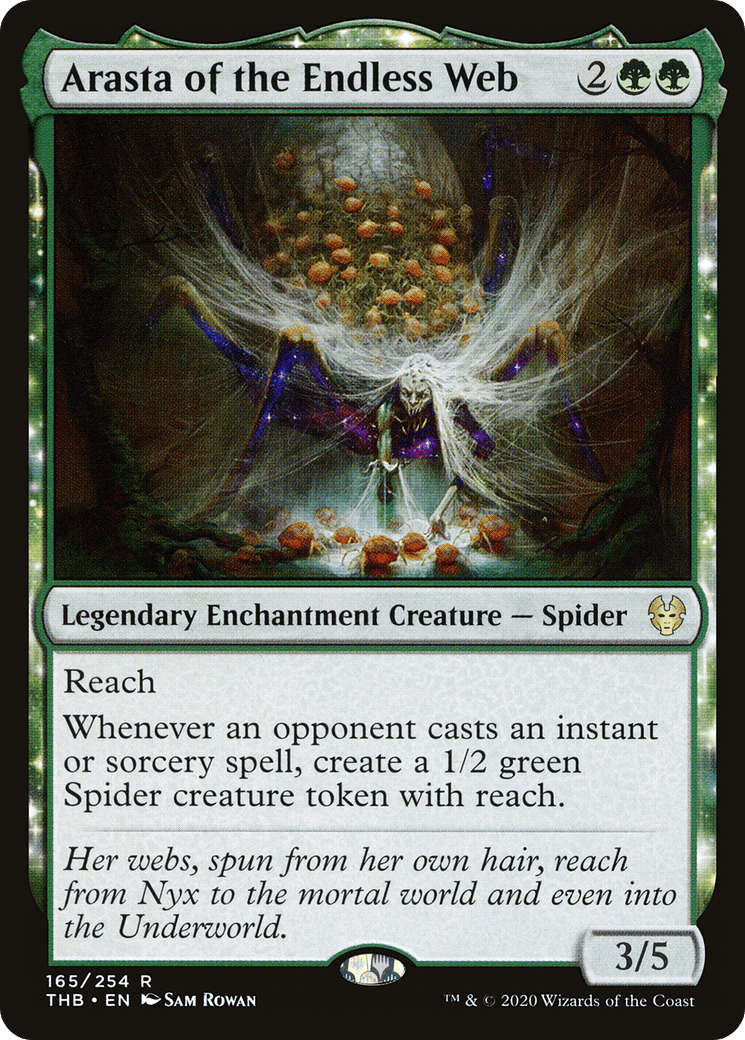 Whenever an opponent casts an instant or sorcery spell, create a 1/2 green Spider creature token with reach.