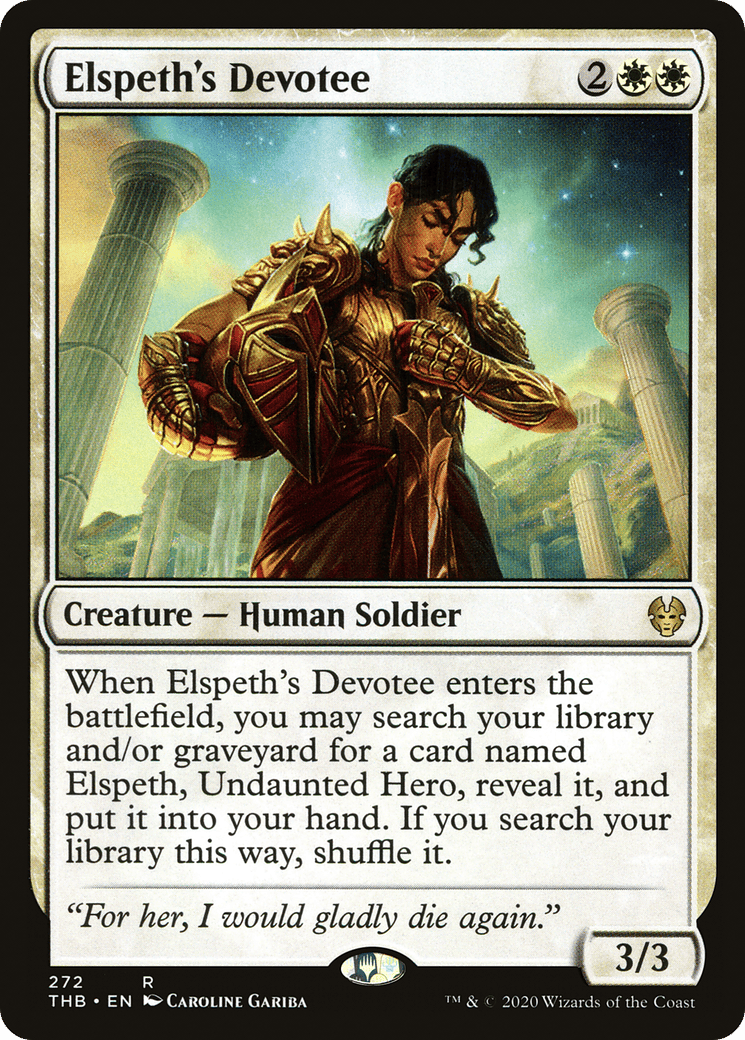 When this creature enters, you may search your library and/or graveyard for a card named Elspeth, Undaunted Hero, reveal it, and put it into your hand. If you search your library this way, shuffle.