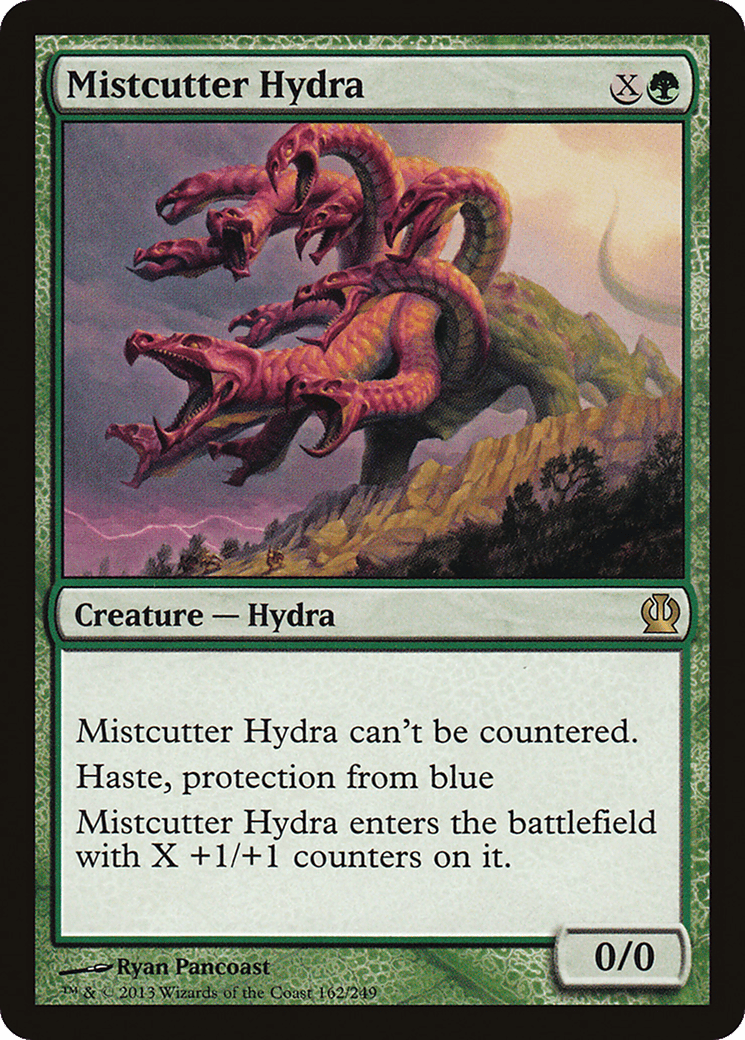 This spell can’t be countered. Haste, protection from blue This creature enters with X +1/+1 counters on it.
