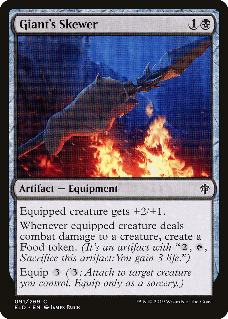 Whenever equipped creature deals combat damage to a creature, create a Food token. (It’s an artifact with “{2}, {T}, Sacrifice this token: You gain 3 life.”)