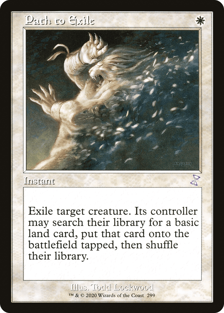 Exile target creature. Its controller may search their library for a basic land card, put that card onto the battlefield tapped, then shuffle.