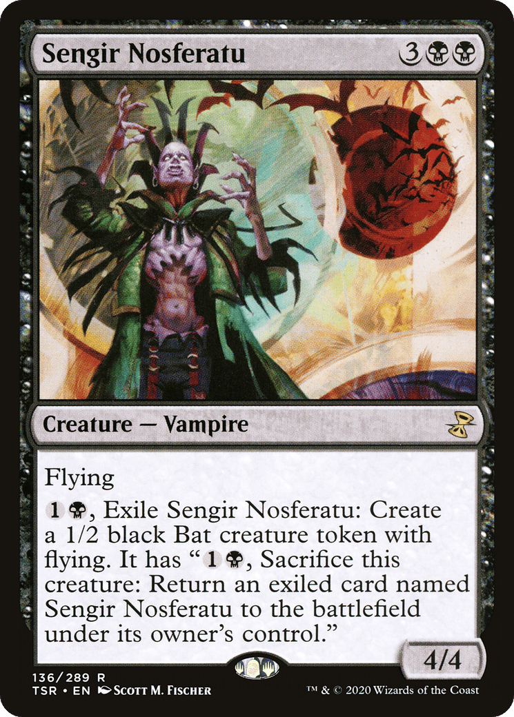 {1}{B}, Exile this creature: Create a 1/2 black Bat creature token with flying. It has “{1}{B}, Sacrifice this token: Return an exiled card named Sengir Nosferatu to the battlefield under its owner’s control.”