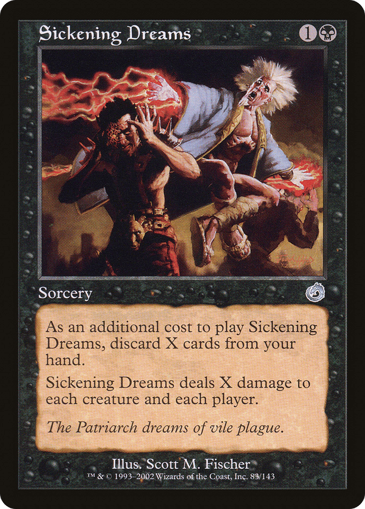 As an additional cost to cast this spell, discard X cards. Sickening Dreams deals X damage to each creature and each player.