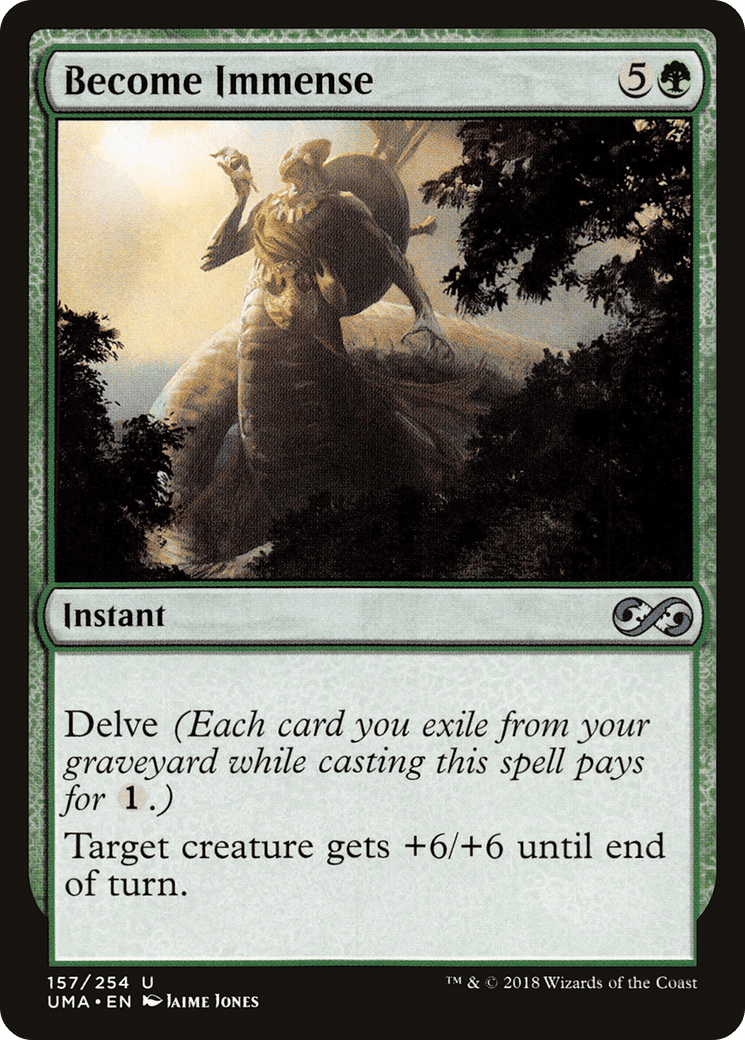 Delve (Each card you exile from your graveyard while casting this spell pays for {1}.) Target creature gets +6/+6 until end of turn.