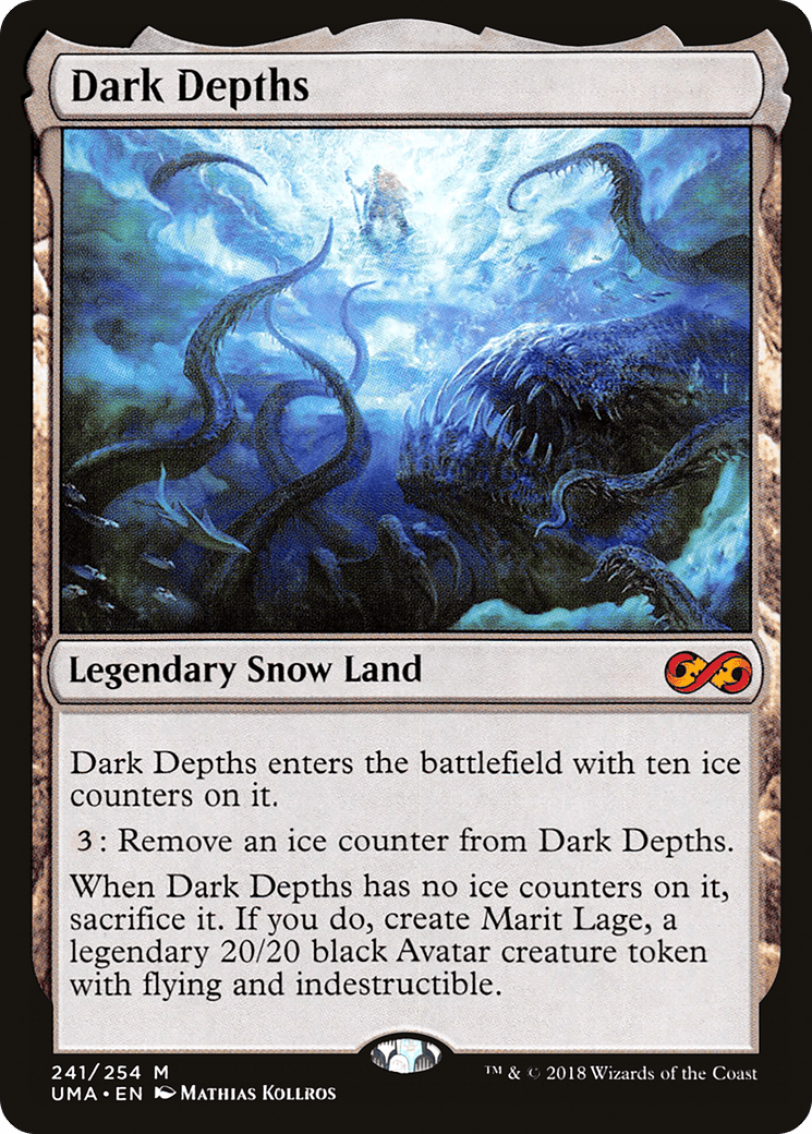 When Dark Depths has no ice counters on it, sacrifice it. If you do, create Marit Lage, a legendary 20/20 black Avatar creature token with flying and indestructib