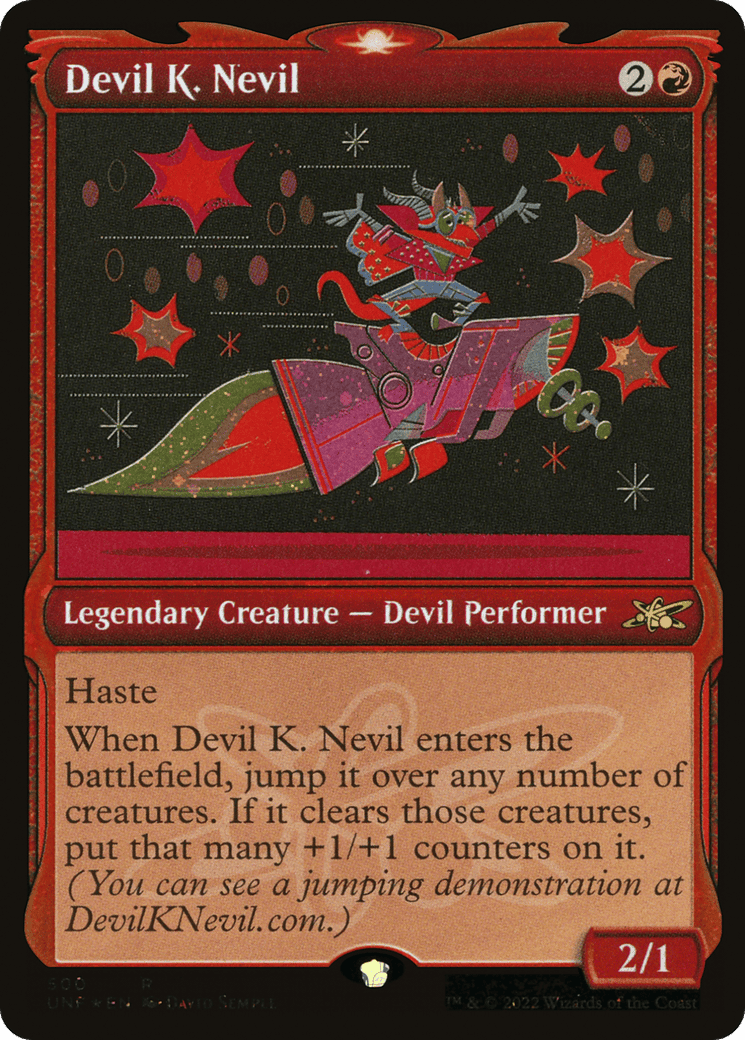 When Devil K. Nevil enters, jump it over any number of creatures. If it clears those creatures, put that many +1/+1 counters on it. (You can see a jumping demonstration at DevilKNevil.com.)