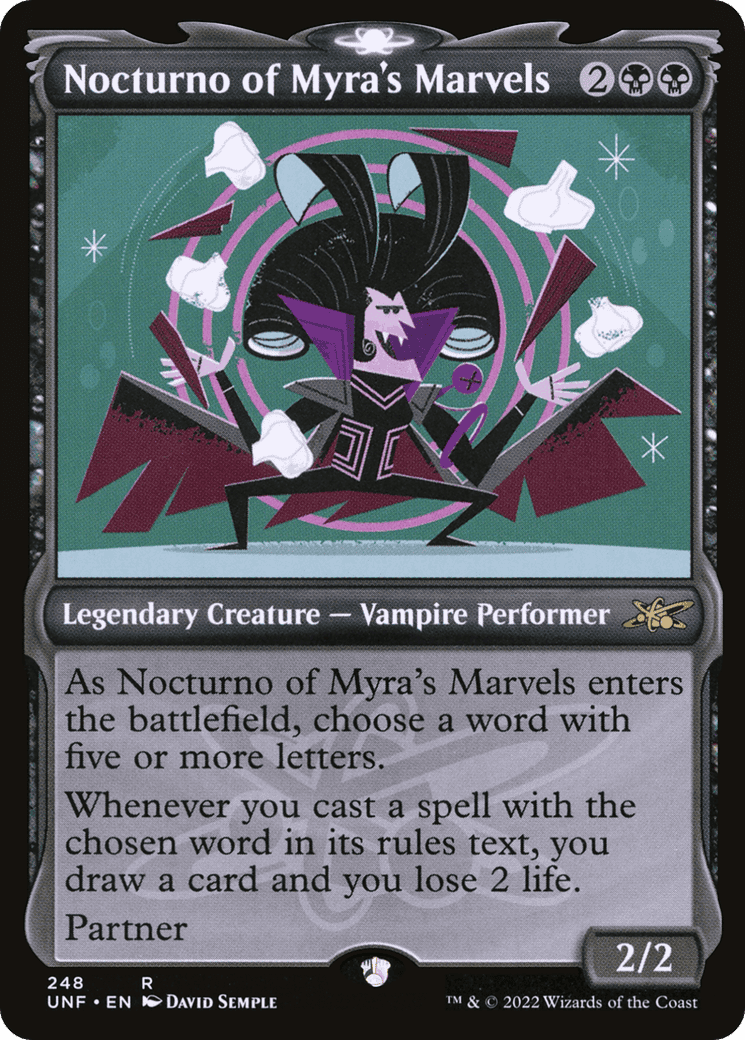 As Nocturno of Myra’s Marvels enters, choose a word with five or more letters.