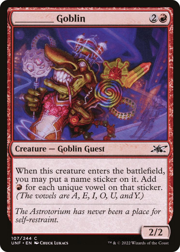 When this creature enters, you may put a name sticker on it. Add {R} for each unique vowel on that sticker. (The vowels are A, E, I, O, U, and Y.)