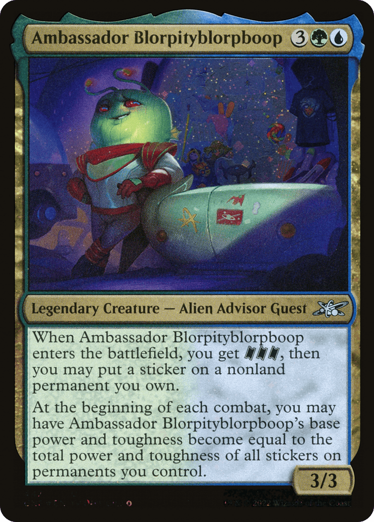When Ambassador Blorpityblorpboop enters, you get {TK}{TK}{TK}, then you may put a sticker on a nonland permanent you own.