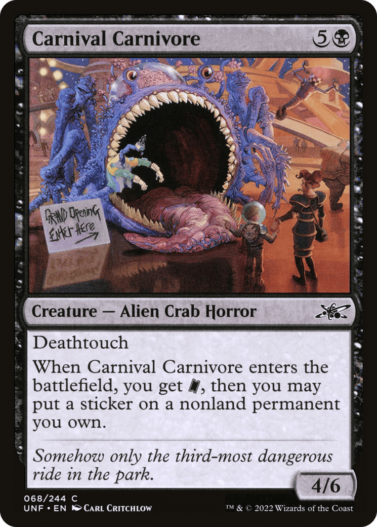 When Carnival Carnivore enters, you get {TK}, then you may put a sticker on a nonland permanent you own.