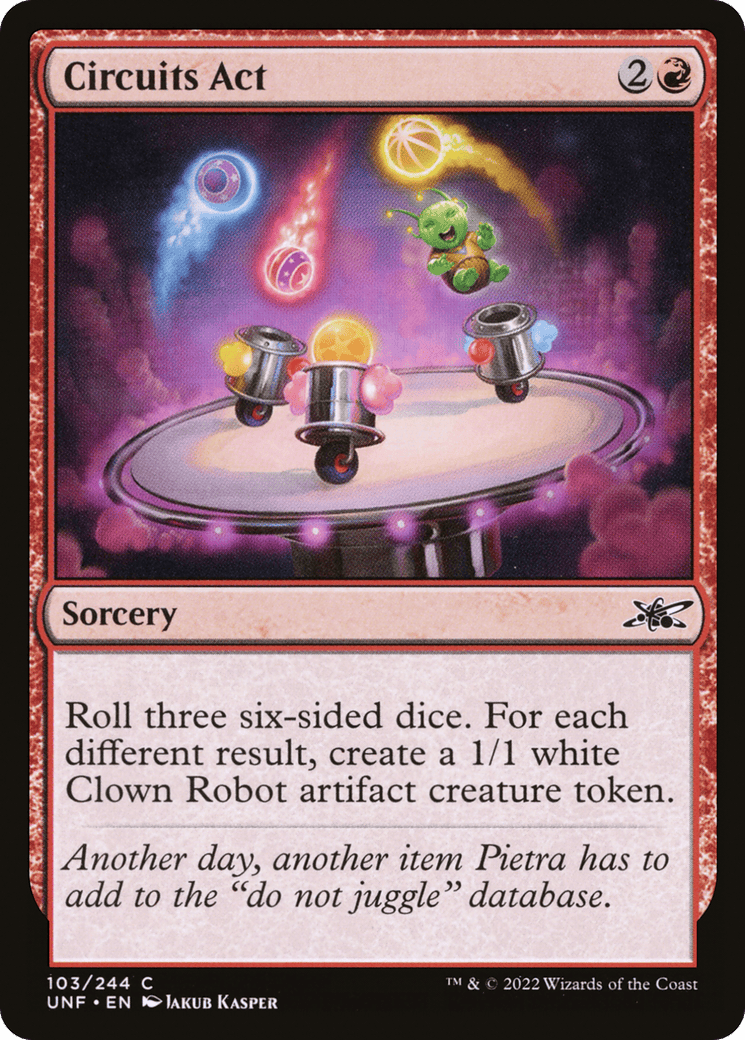 Roll three six-sided dice. For each different result, create a 1/1 white Clown Robot artifact creature token.