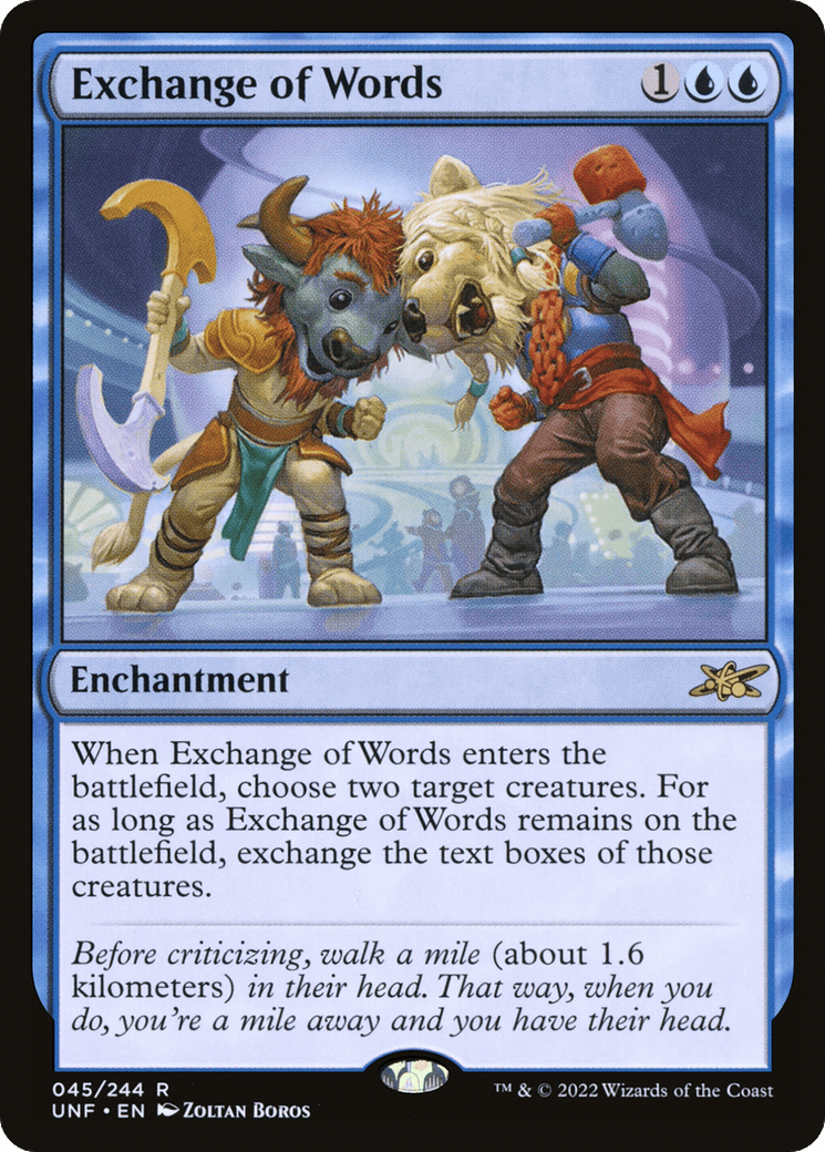 When this enchantment enters, choose two target creatures. For as long as this enchantment remains on the battlefield, exchange the text boxes of those creatures.