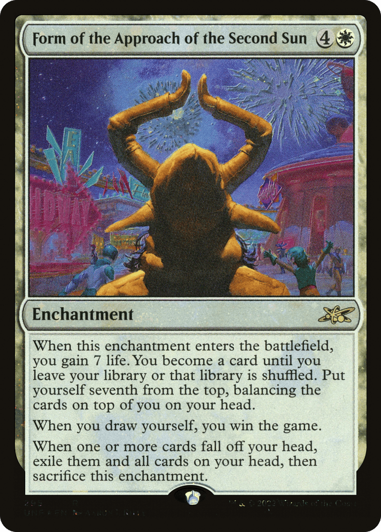 When this enchantment enters, you gain 7 life. You become a card until you leave your library or that library is shuffled. Put yourself seventh from the top, balancing the cards on top of you on your head.