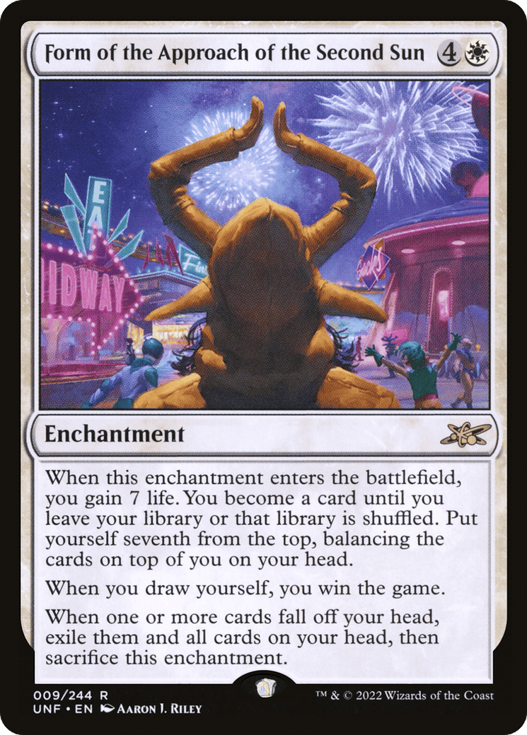 When this enchantment enters, you gain 7 life. You become a card until you leave your library or that library is shuffled. Put yourself seventh from the top, balancing the cards on top of you on your head.