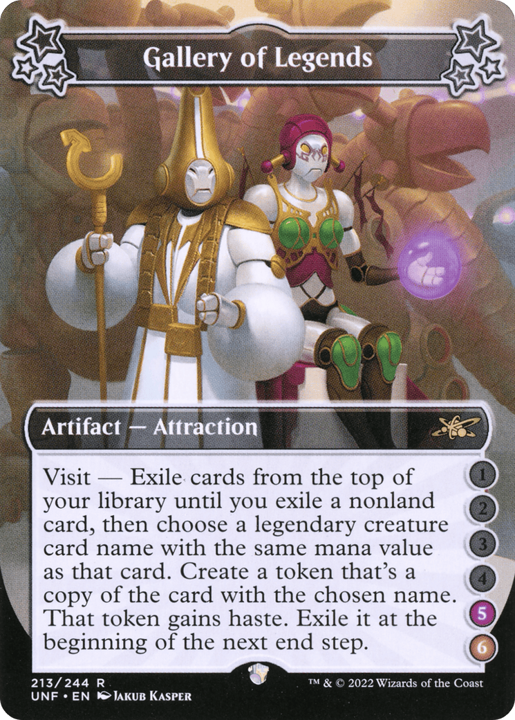 Visit – Exile cards from the top of your library until you exile a nonland card, then choose a legendary creature card name with the same mana value as that card. Create a token that’s a copy of the card with the chosen name. That token gains haste. Exile