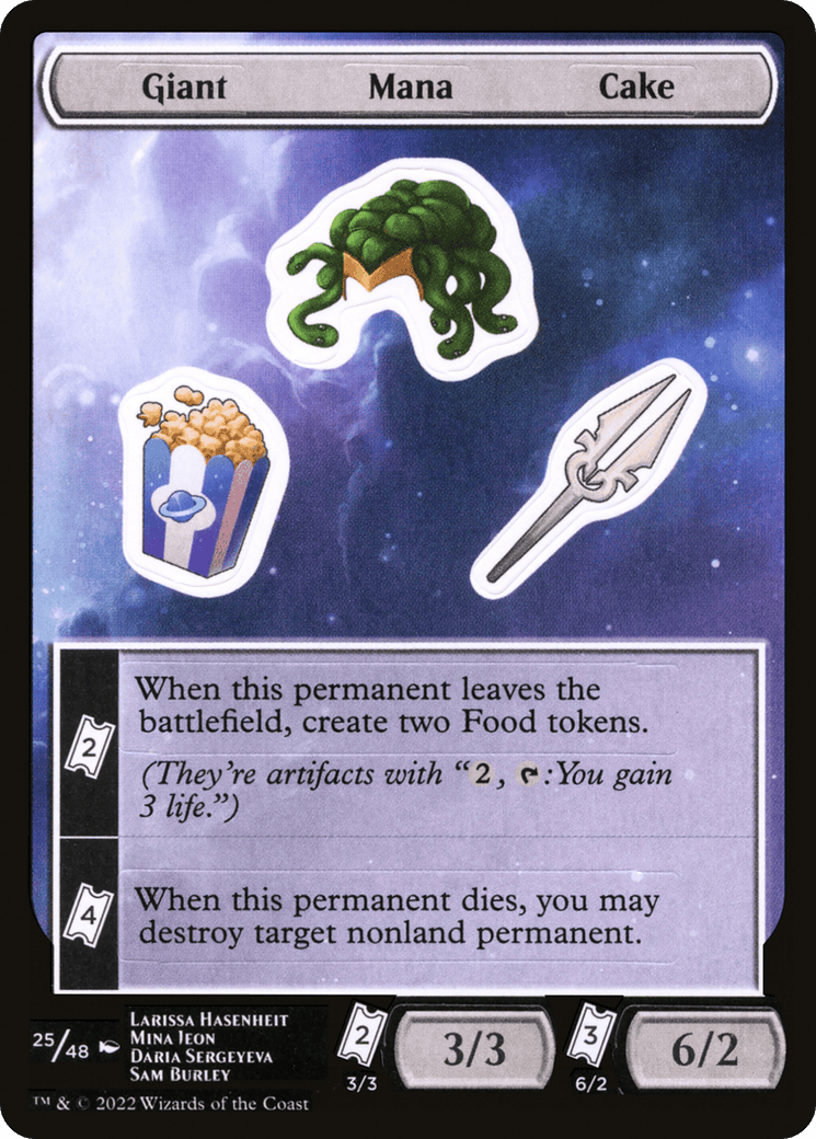 {TK}{TK} – When this permanent leaves the battlefield, create two Food tokens. (They’re artifacts with “{2}, {T}, Sacrifice this artifact: You gain 3 life.”)