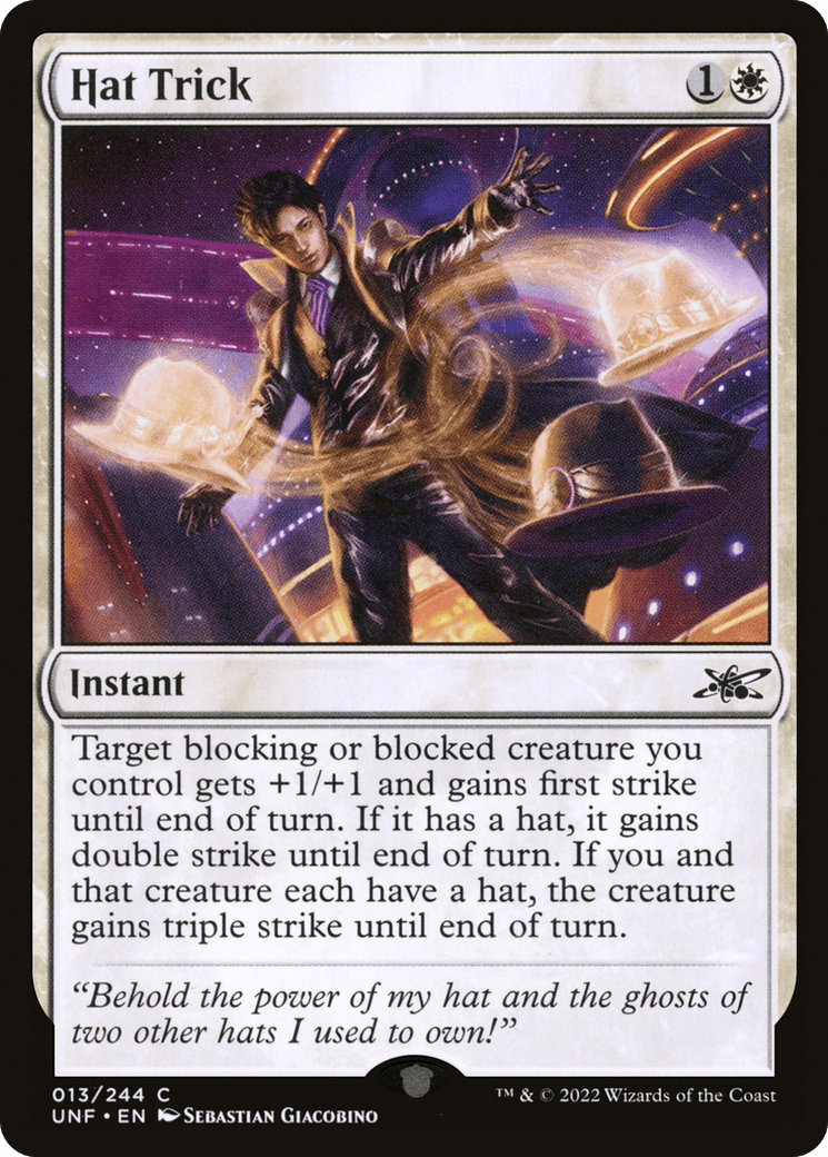 Target blocking or blocked creature you control gets +1/+1 and gains first strike until end of turn. If it has a hat, it gains double strike until end of turn. If you and that creature each have a hat, the creature gains triple strike until end of turn.