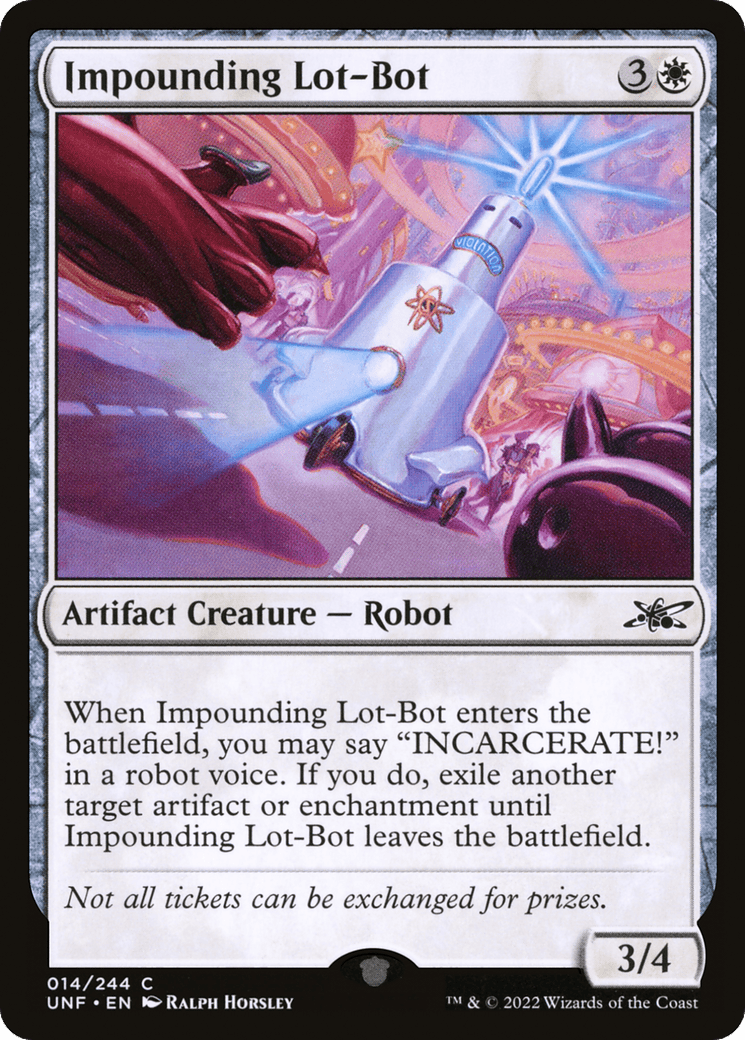 When this creature enters, you may say “INCARCERATE!” in a robot voice. If you do, exile another target artifact or enchantment until this creature leaves the battlefield.