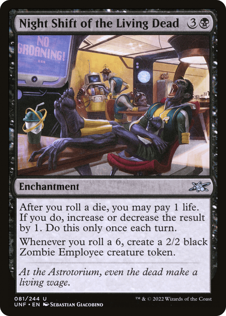 Whenever you roll a 6, create a 2/2 black Zombie Employee creature token.