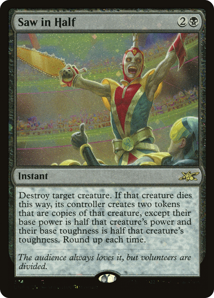 Destroy target creature. If that creature dies this way, its controller creates two tokens that are copies of that creature, except their power is half that creature’s power and their toughness is half that creature’s toughness. Round up each time.