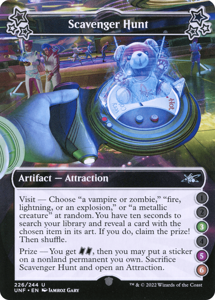 Visit – Choose “a vampire or zombie,” “fire, lightning, or an explosion,” or “a metallic creature” at random. You have ten seconds to search your library and reveal a card with the chosen item in its art. If you do, claim the prize! Then shuffle.