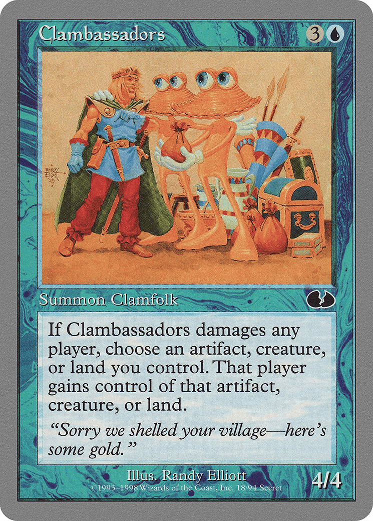 Whenever this creature deals damage to a player, choose an artifact, creature, or land you control. That player gains control of that permanent.