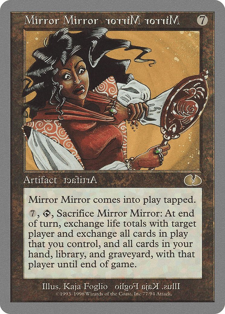 {7}, {T}, Sacrifice this artifact: Choose target player. At the beginning of the next end step, exchange life totals with that player, exchange control of all permanents you and that player control, and exchange cards in your